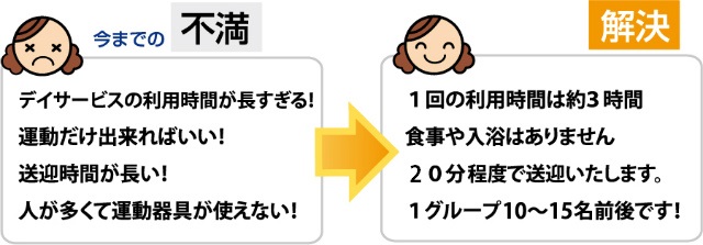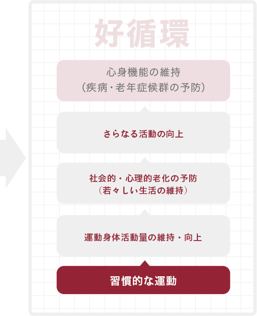早稲田イーライフへ通所し運動(外出・交流)することにより運動減少による悪循環を好循環へ転換させ、QOL(生活の質)が向上します。